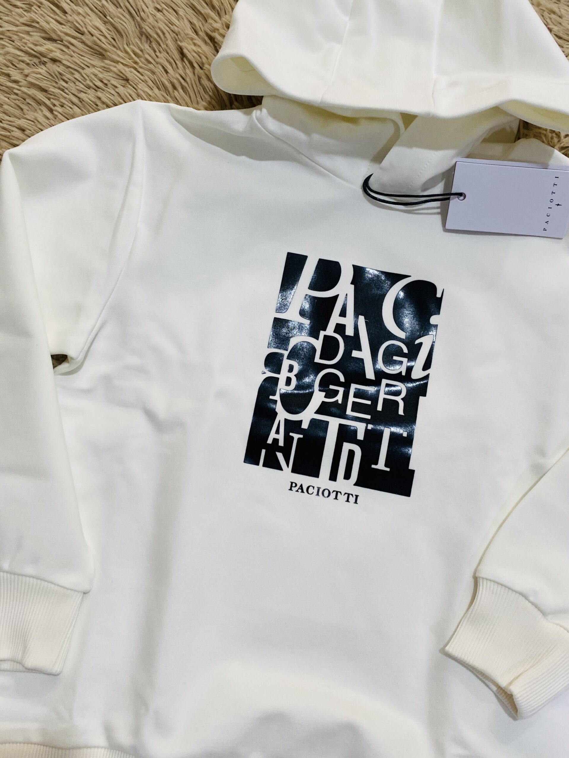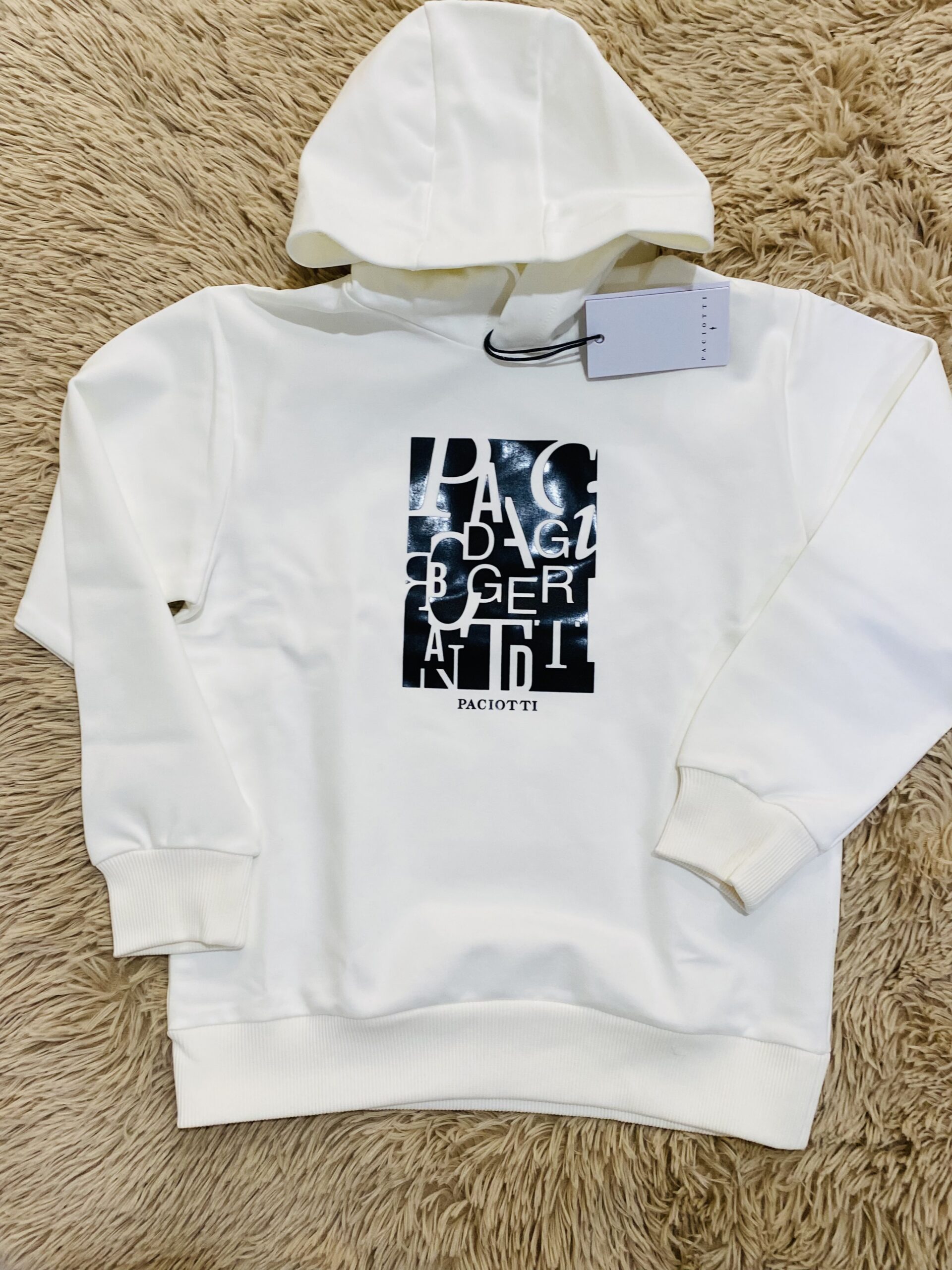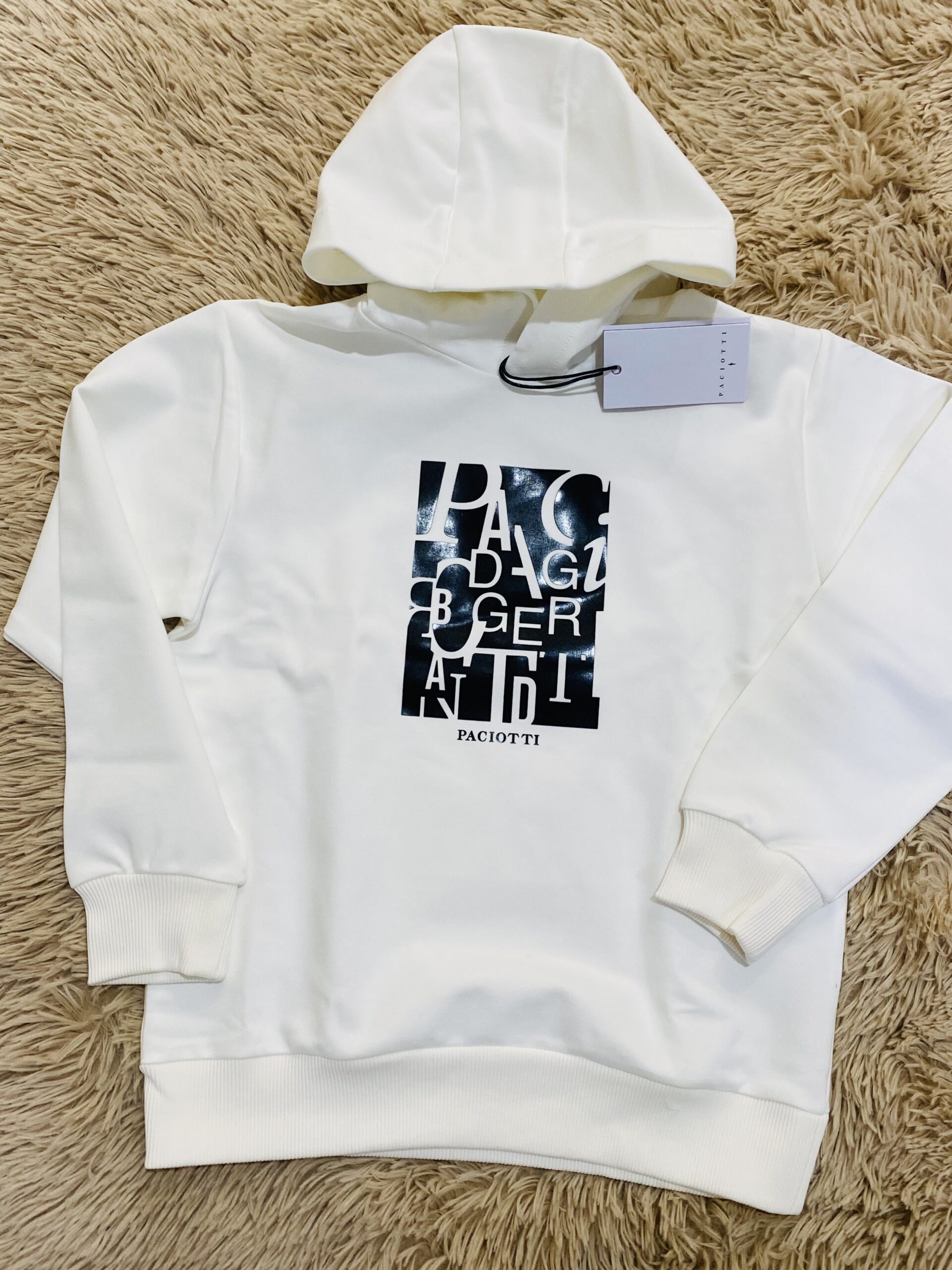 Felpa paciotti latte con logo a rilievo nero, tessuto interno garzato.