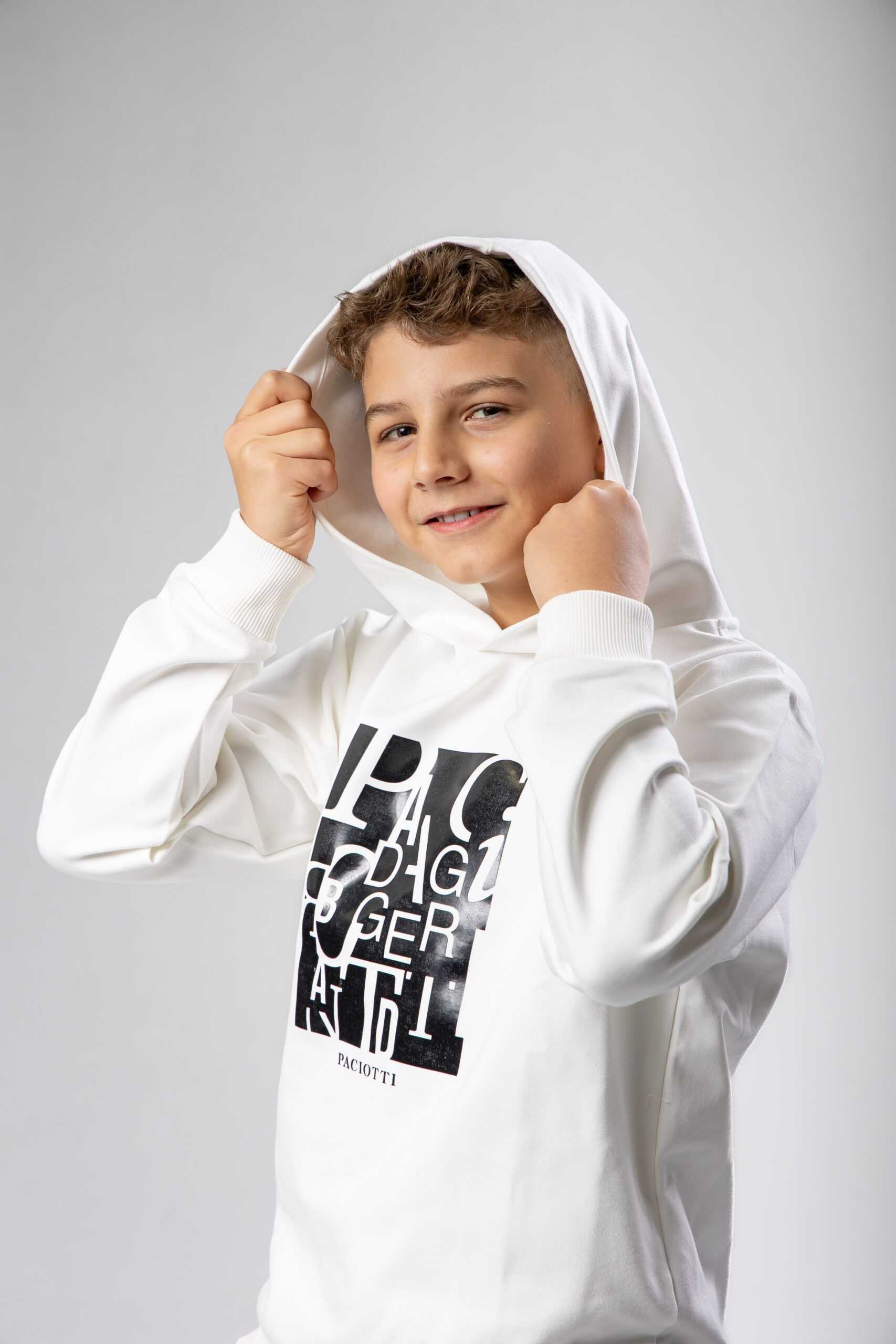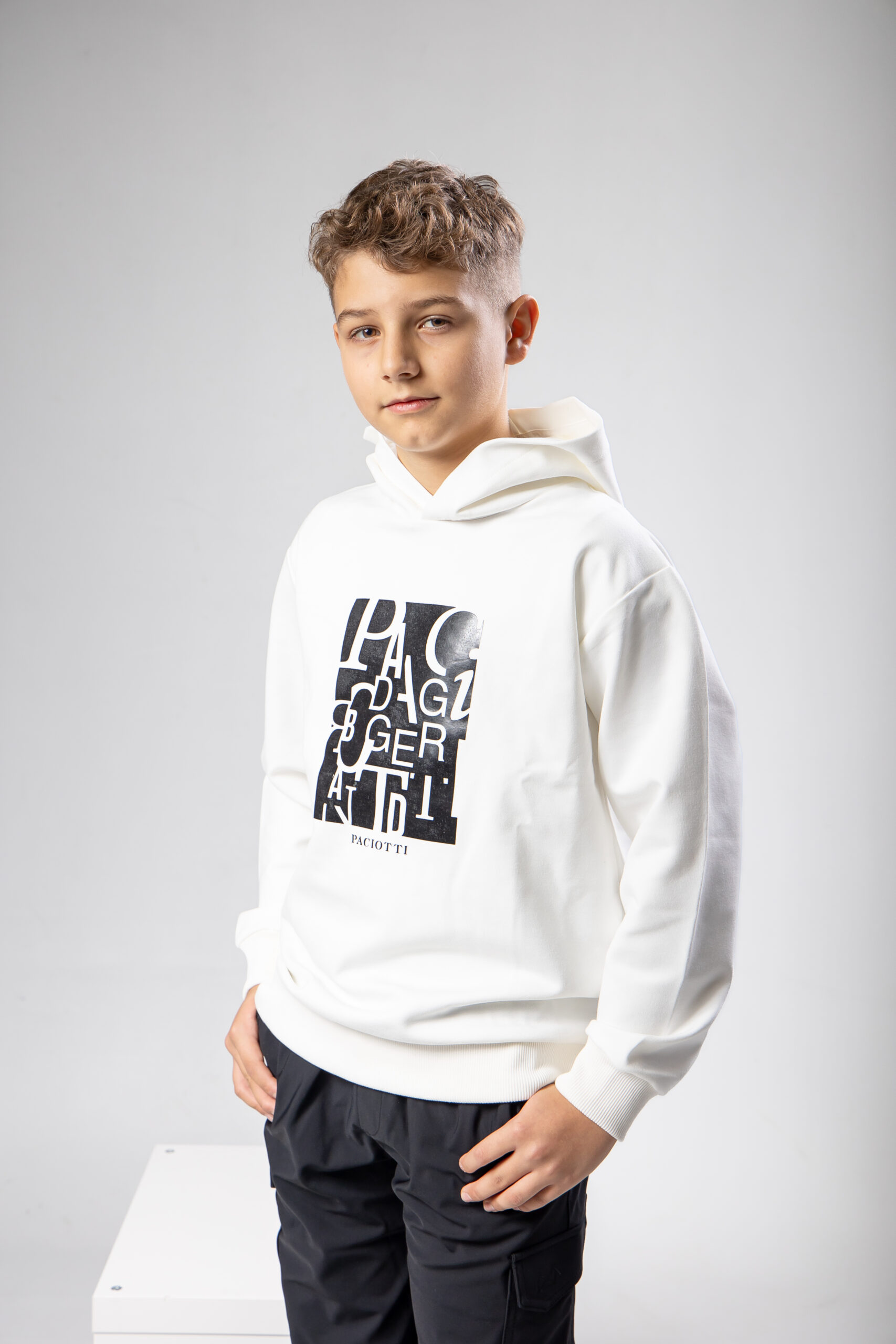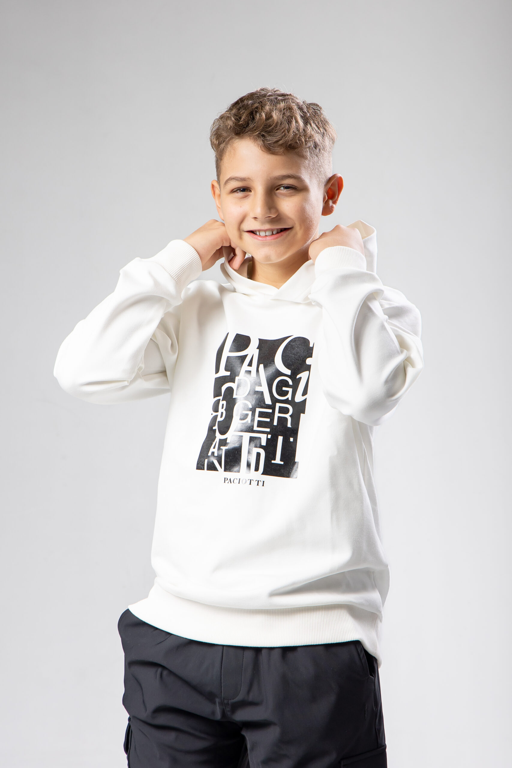 Felpa paciotti latte con logo a rilievo nero, tessuto interno garzato.