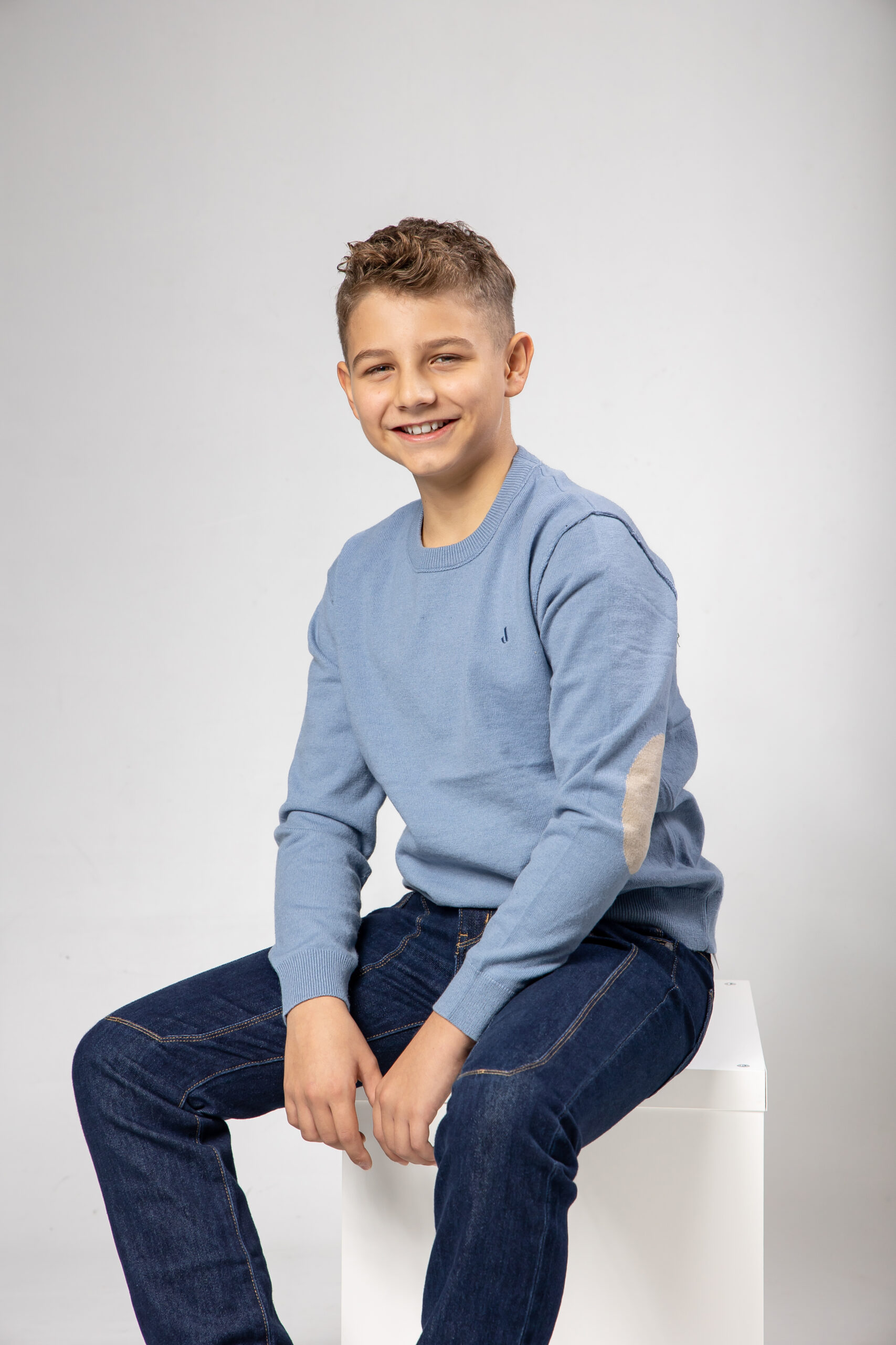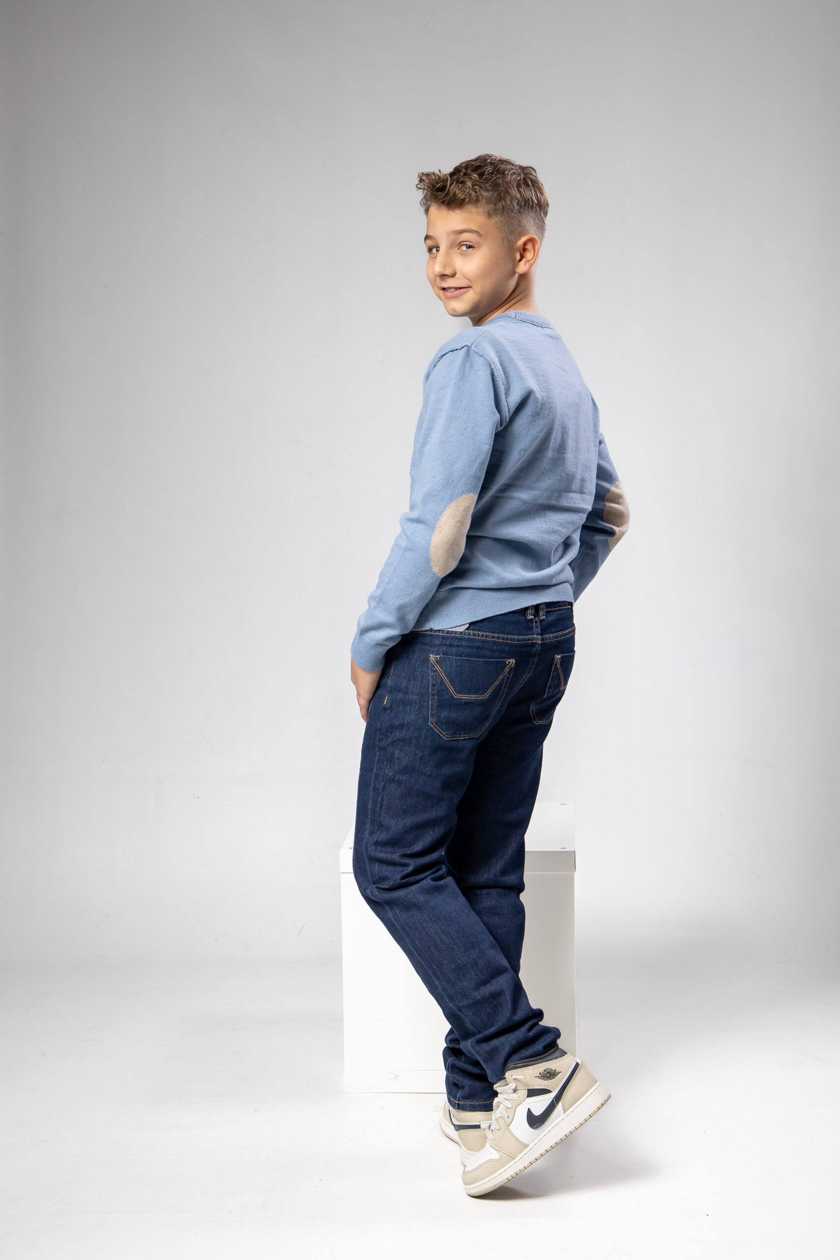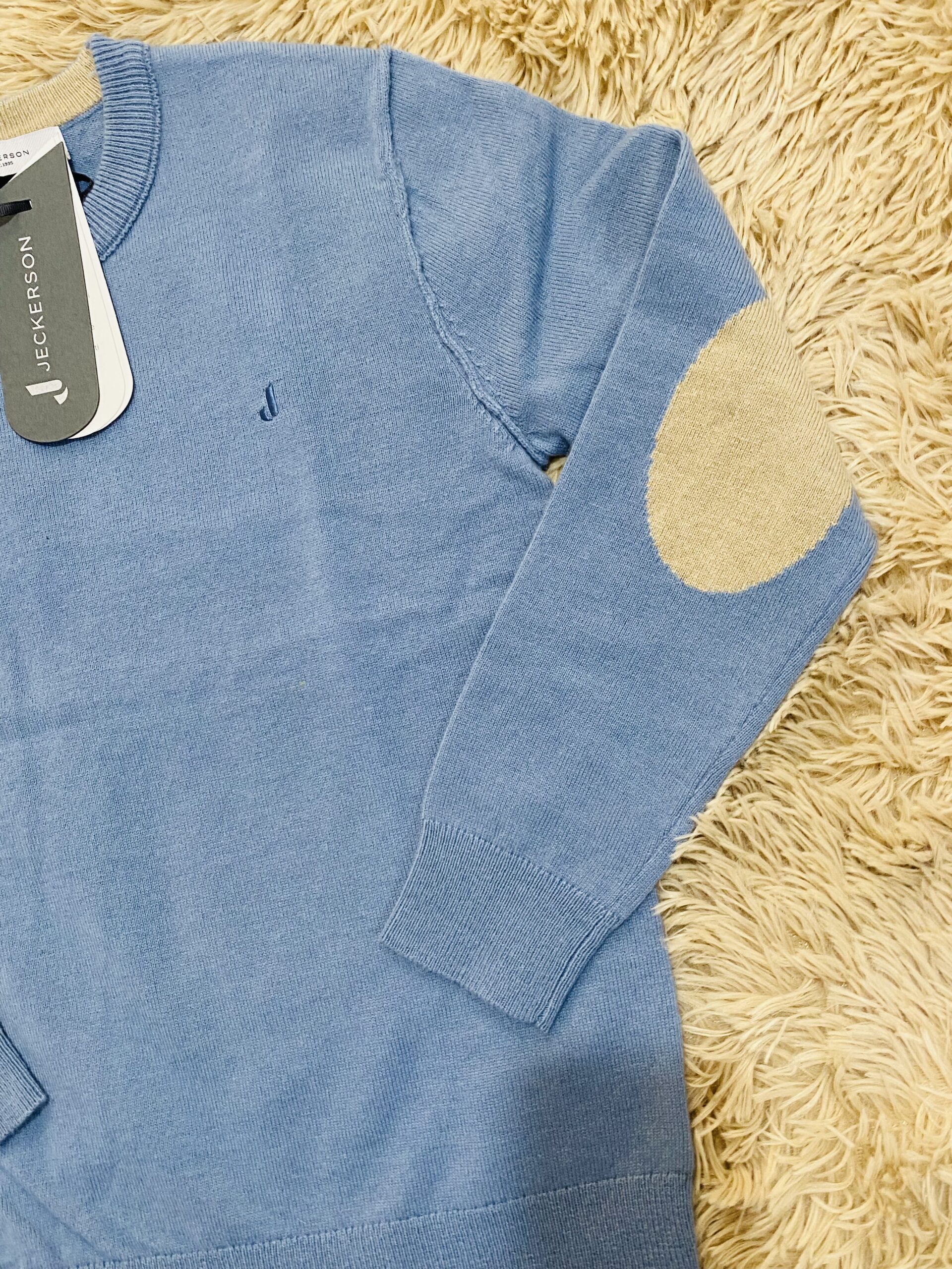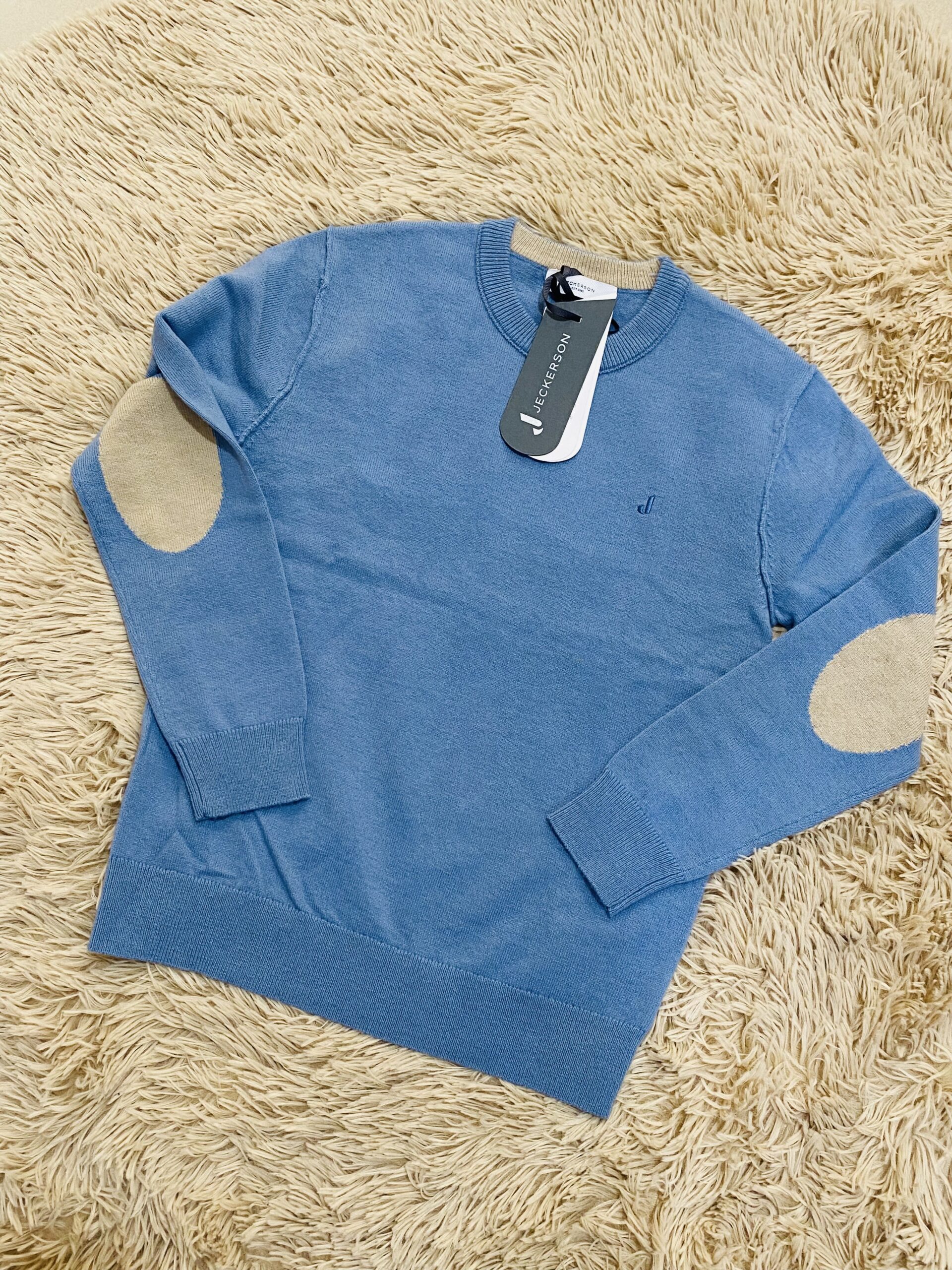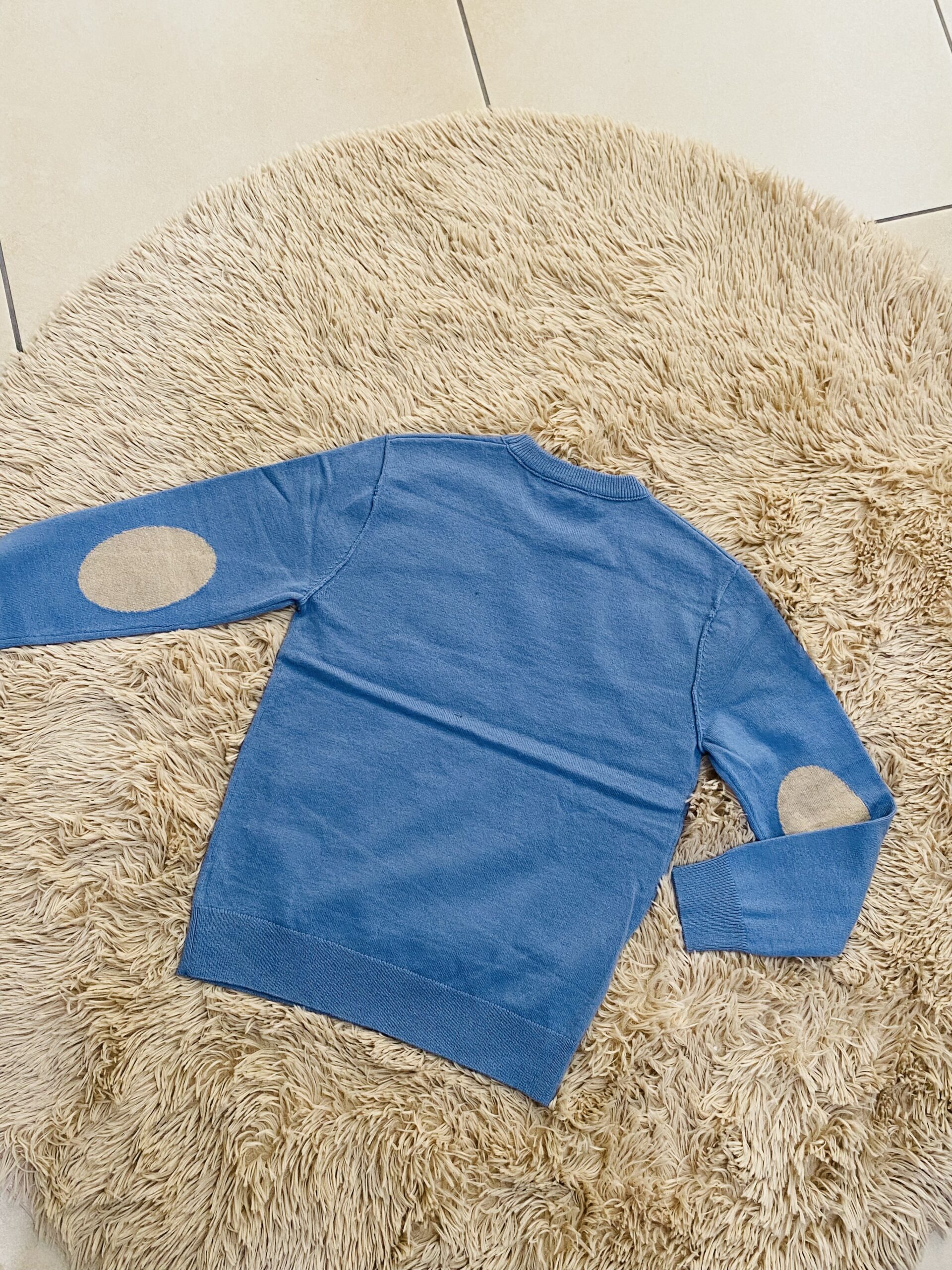 Maglioncino rasato azzurro polvere con toppa sui gomiti beige.