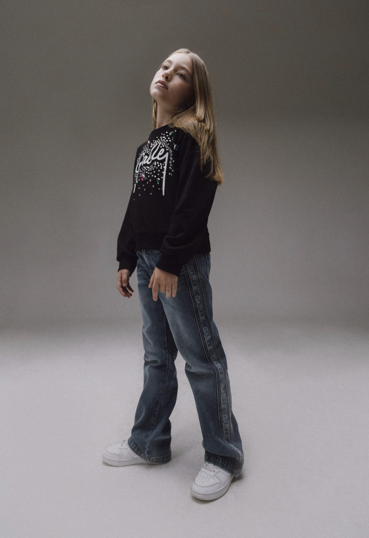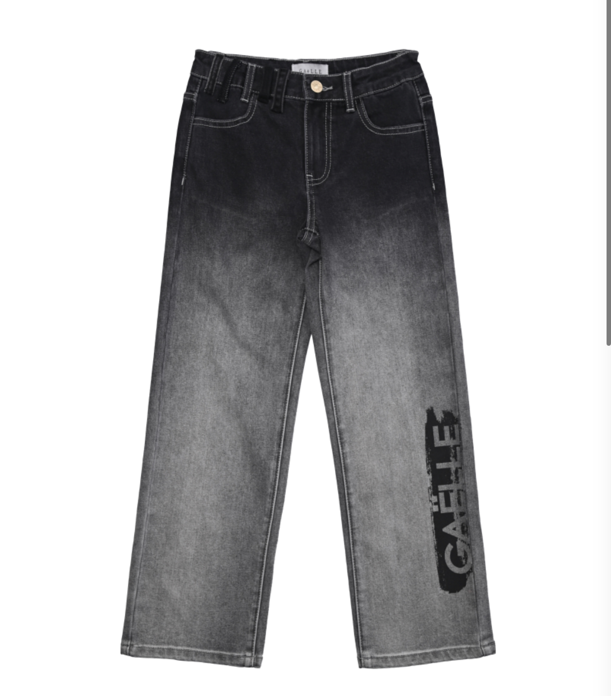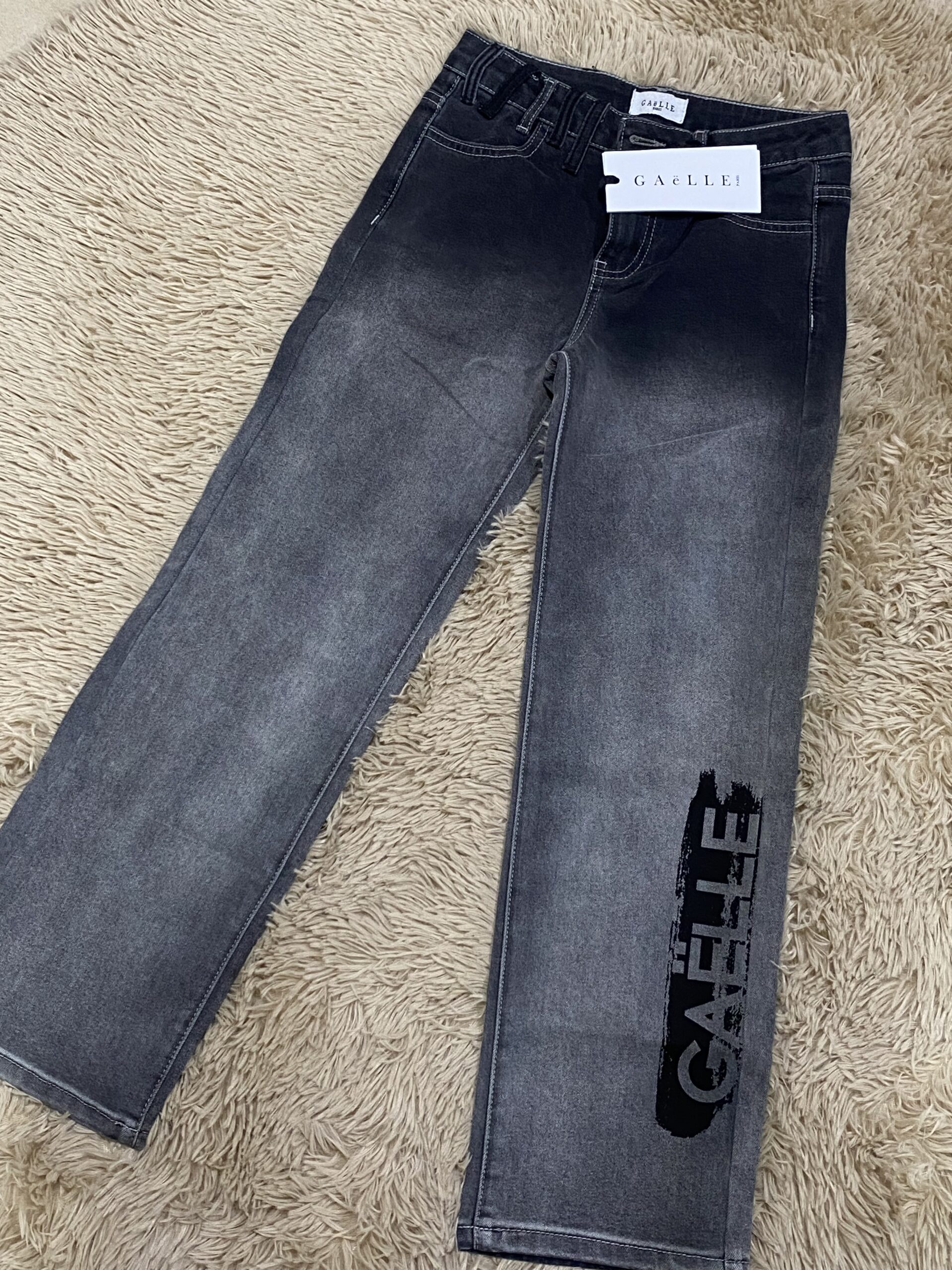 Bellissimo Jeans nero e fumo con logo sulla gamba. Cade leggermente a Palazzo vestibilità normale, leggermente a vita bassa.