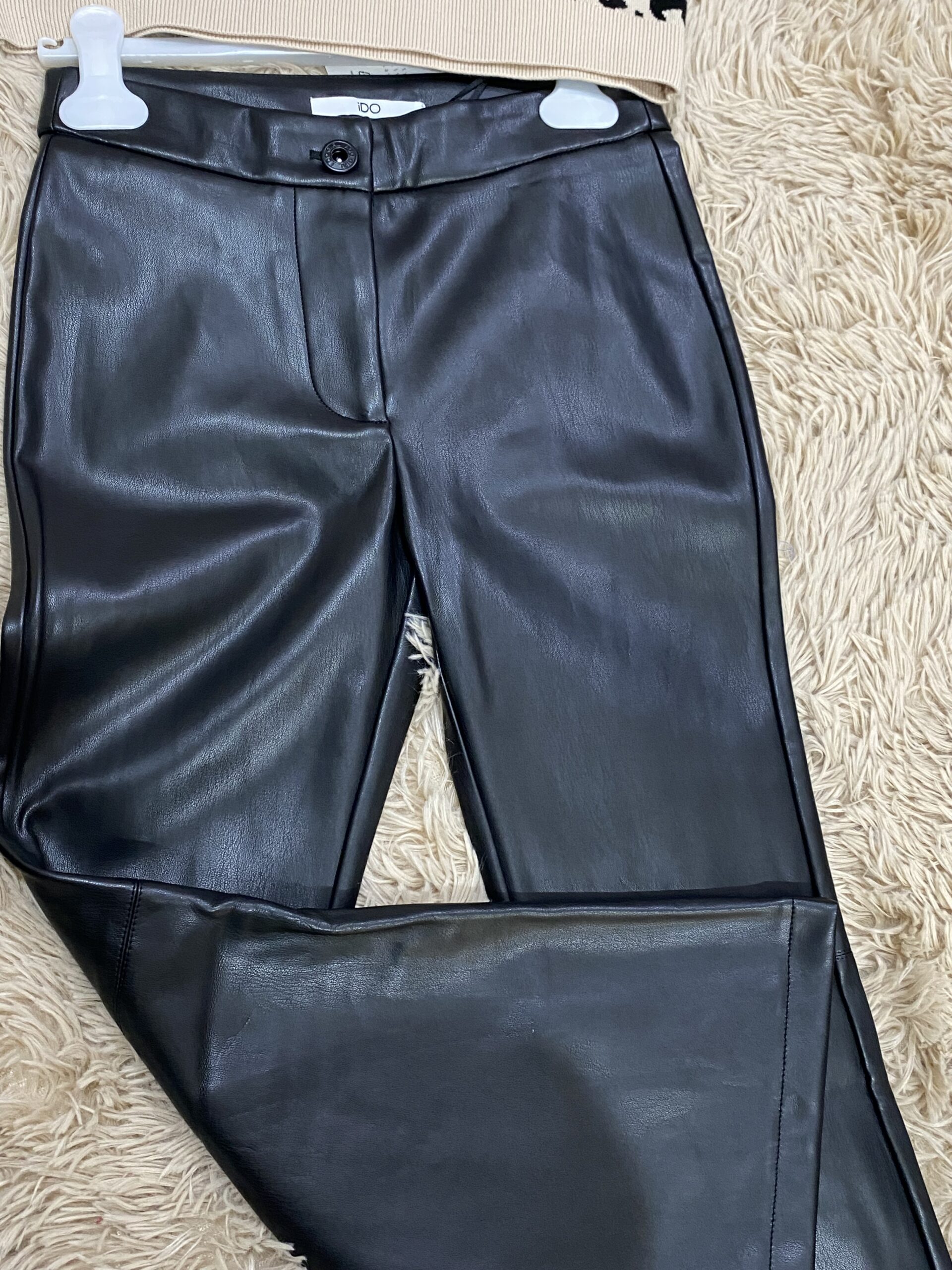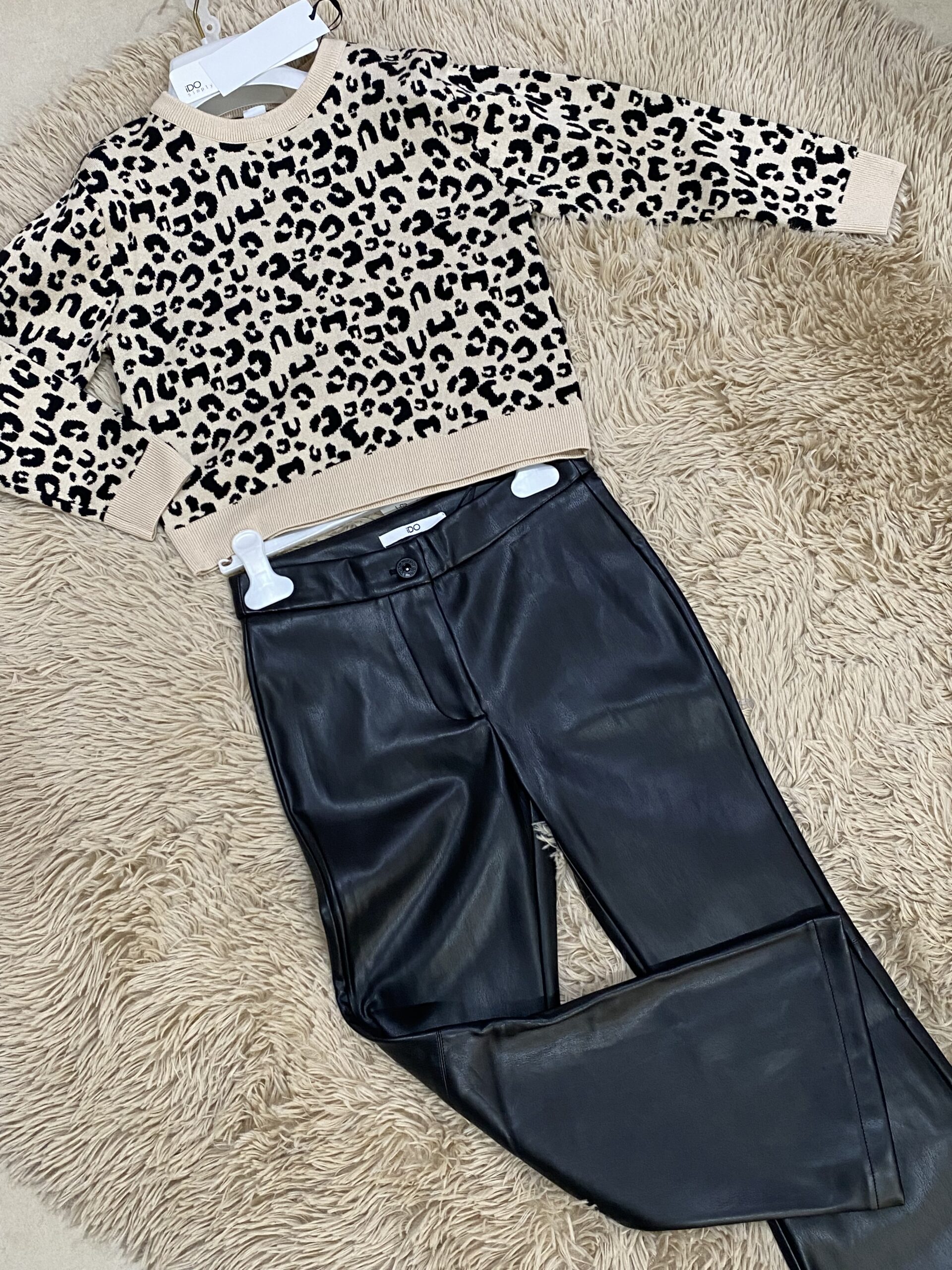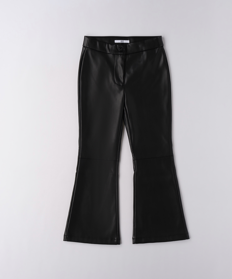 Pantalone ragazza in ecopelle nero a zampa, leggermente felpato al suo interno, possibilità di abbinarlo al maglioncino animalier venduto separatamente.