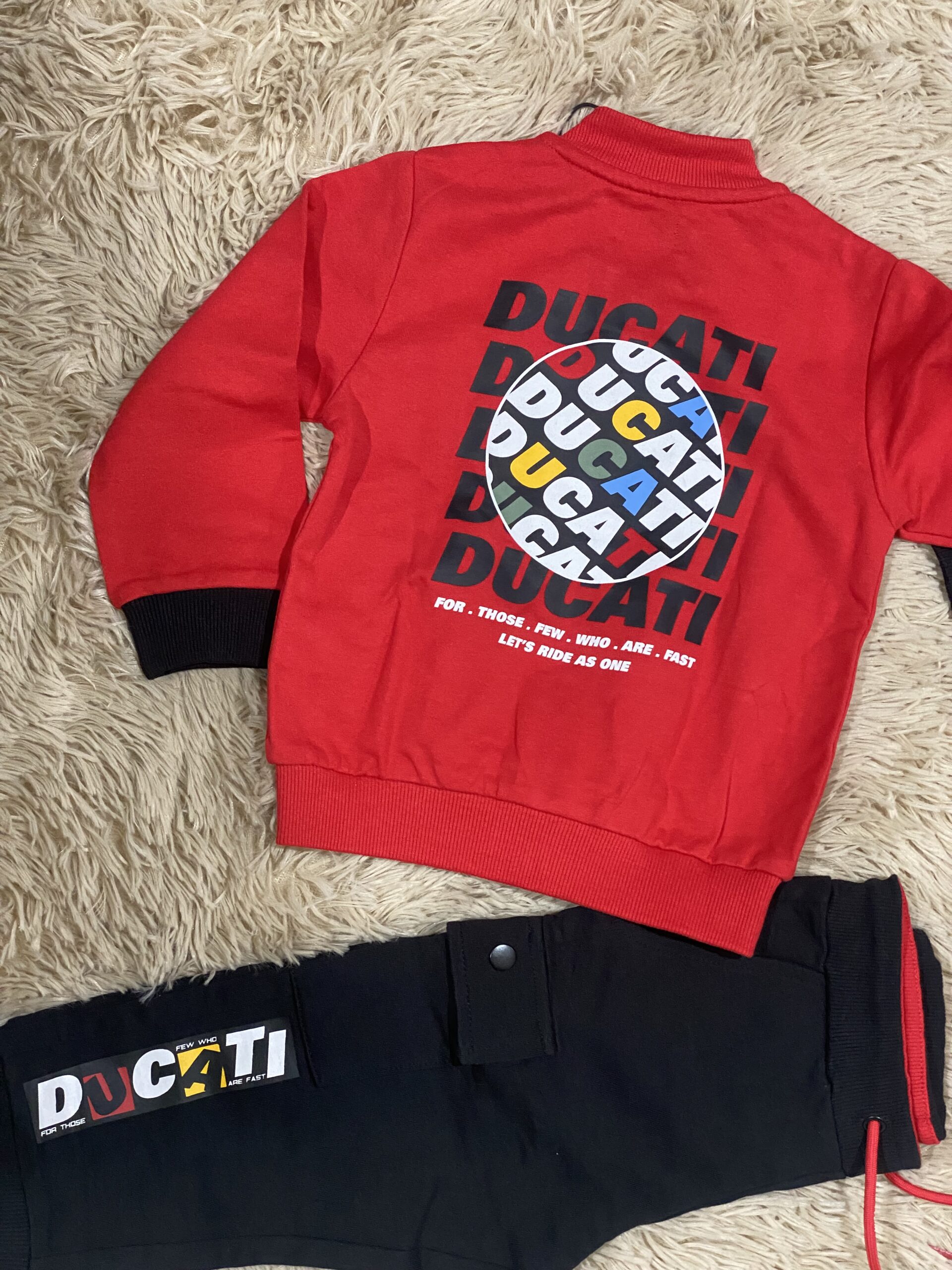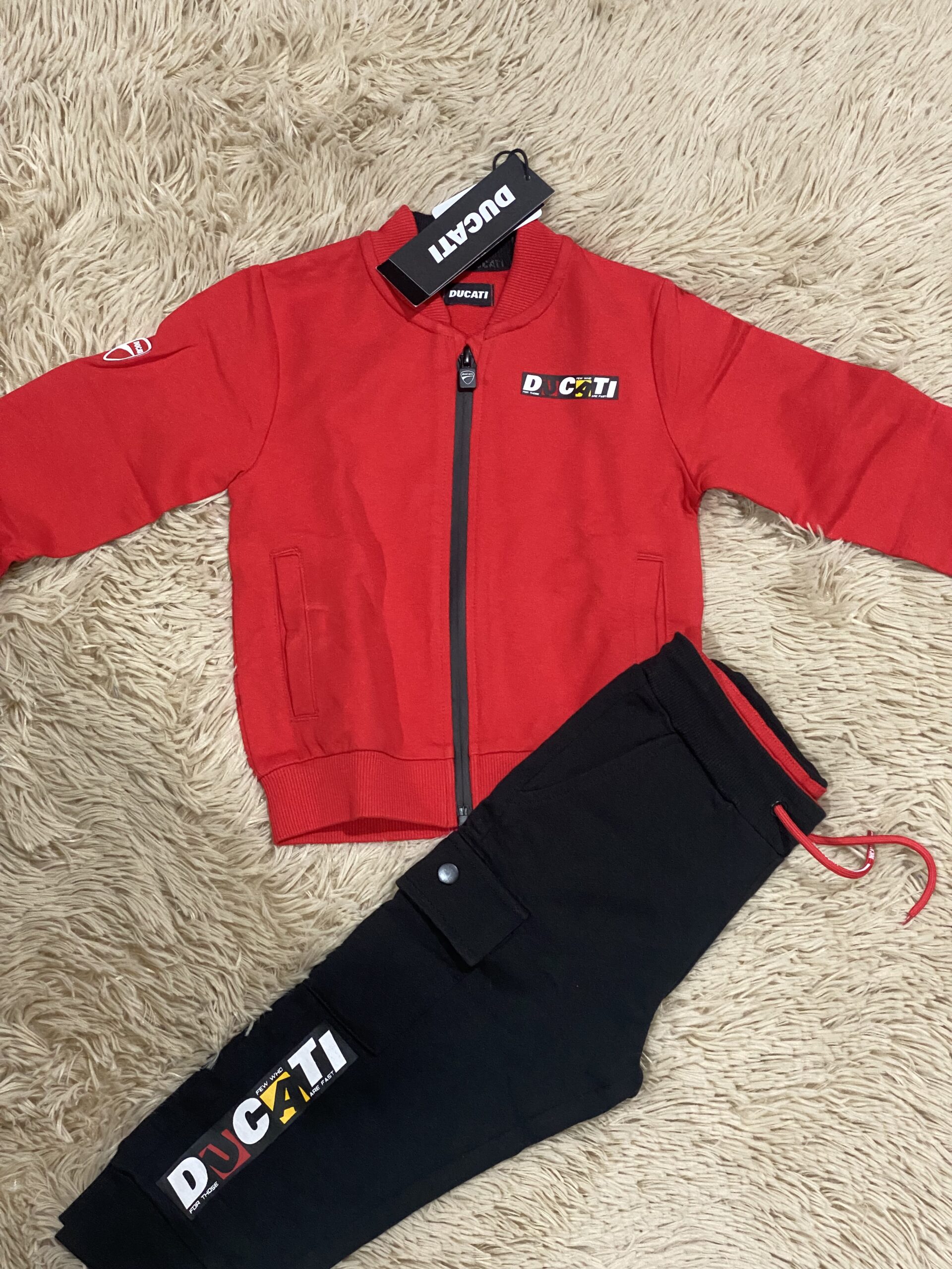 Tuta Ducati bambino composto da felpa con zip rossa con logo dietro, pantalone nero tasconato.