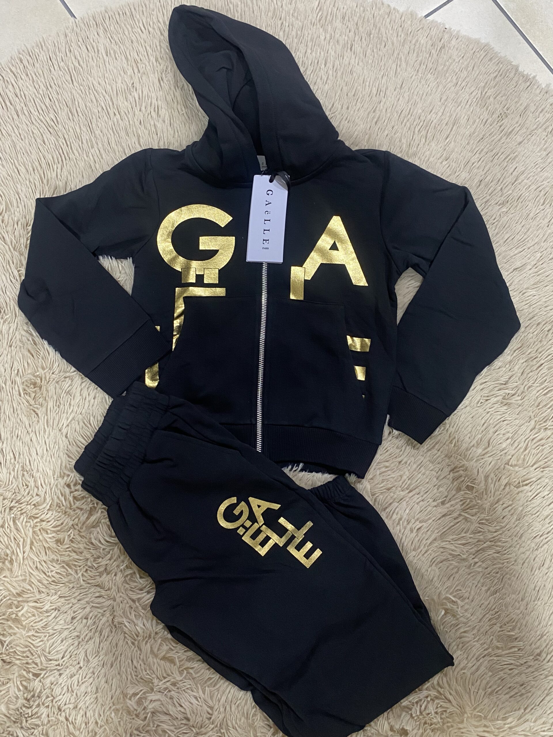 Tuta ragazza con felpa zip e cappuccio, bellissimo pantalone con molla alla caviglia e logo oro. felpata e glamour